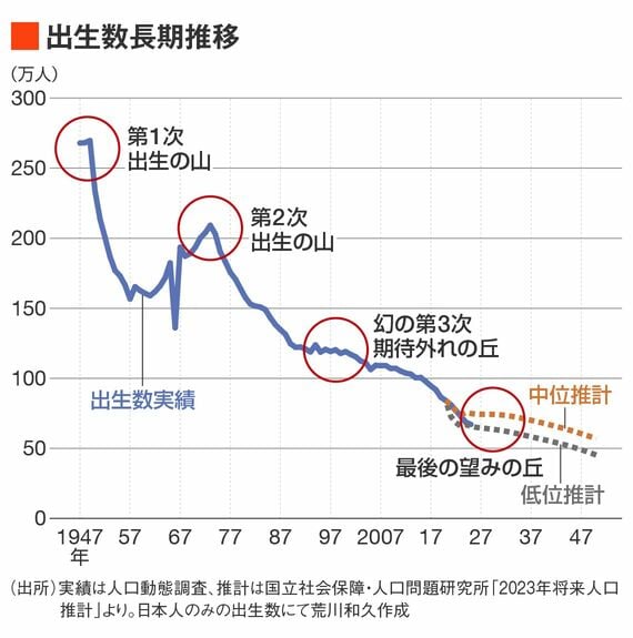 しかし、速報値で明らかになった2025年の出生数見込みは、中位推計の74.9万人には遠く及ばず、最悪ここまで以下には下がらないだろうという低位推計の65.8万人をわずかに上回る程度です。そう考えるととても「良い兆し」とは言えないわけです。