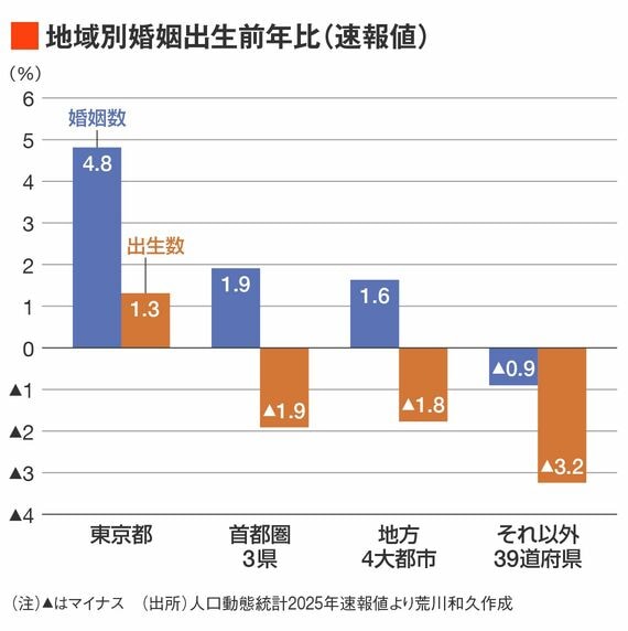 東京は婚姻数も出生数も増えていますが、首都圏三県と地方4大都市は、婚姻が増えていても出生が増えていない。その他39道府県は、婚姻も出生も増えていないという状況です。つまり、婚姻が増えたのは東京含む大都市だけということになります。