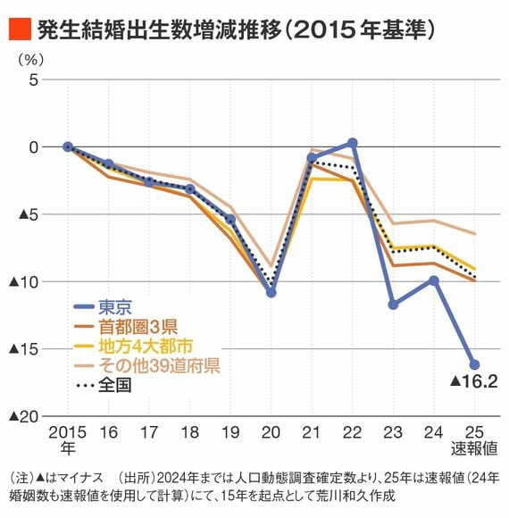 2015年対比で、東京は16.2%減と、もっとも減少幅が大きく、首都圏三県がそれに続きます。つまり、東京圏においては、結婚をしても子どもが産めないという傾向が強まっているということが言えます。