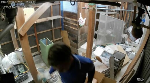 離れへ続く庭にはブロックや植木鉢が20〜30個並んでいる。外観を見ると屋根裏があるはずだが、内部を確認しても屋根裏へ通じる扉が見当たらない。天井を見上げてみても、どこも塞がっている。
