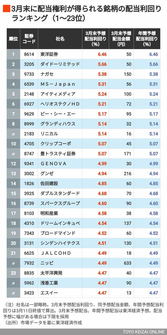 政治・経済・投資 利回り4%以上が61銘柄、首位は6%超! 3月に権利取りできる「配当利回りの高い銘柄」ランキングTOP202 3分で読める 公開日時:2026/03/16 05:45 東洋経済オンライン編集部 フォロー 1/9 PAGES 2/9 PAGES 10位までが「利回り5%超」 次ページが続きます:【続いて26~50位】 3/9 PAGES 4/9 PAGES 5/9 PAGES 6/9 PAGES 7/9 PAGES 8/9 PAGES 9/9 PAGES