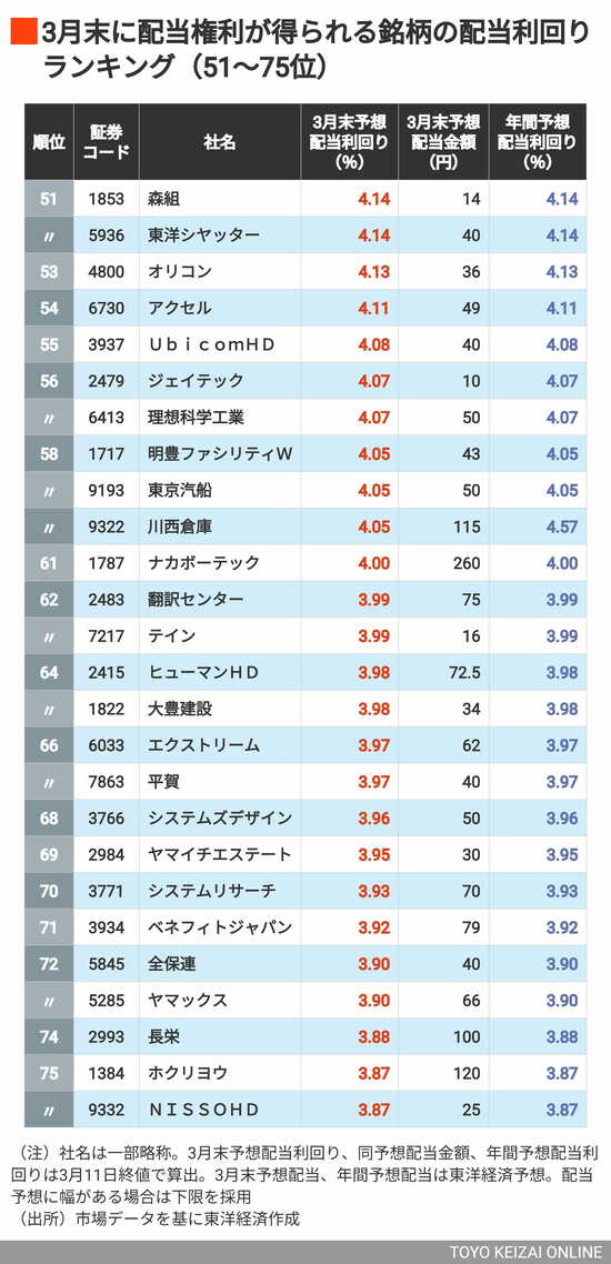 政治・経済・投資 利回り4%以上が61銘柄、首位は6%超! 3月に権利取りできる「配当利回りの高い銘柄」ランキングTOP202 3分で読める 公開日時:2026/03/16 05:45 東洋経済オンライン編集部 フォロー 1/9 PAGES 2/9 PAGES 3/9 PAGES 4/9 PAGES 「利回り4%以上」は61銘柄 次ページが続きます:【77~99位は?】 5/9 PAGES 6/9 PAGES 7/9 PAGES 8/9 PAGES 9/9 PAGES