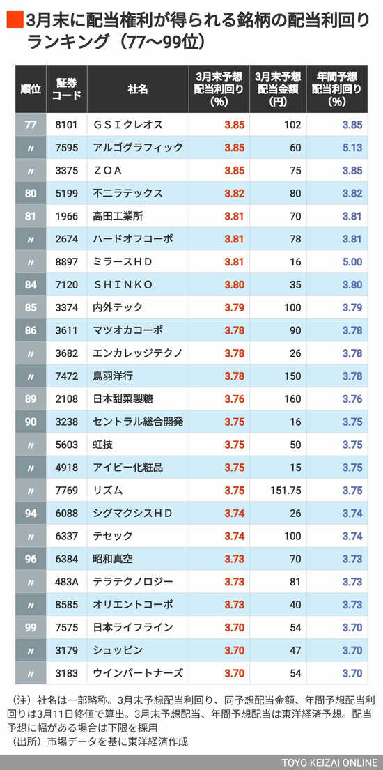 政治・経済・投資 利回り4%以上が61銘柄、首位は6%超! 3月に権利取りできる「配当利回りの高い銘柄」ランキングTOP202 3分で読める 公開日時:2026/03/16 05:45 東洋経済オンライン編集部 フォロー 1/9 PAGES 2/9 PAGES 3/9 PAGES 4/9 PAGES 5/9 PAGES あのリユースショップもランクイン 次ページが続きます:【さらに102~125位】 6/9 PAGES 7/9 PAGES 8/9 PAGES 9/9 PAGES