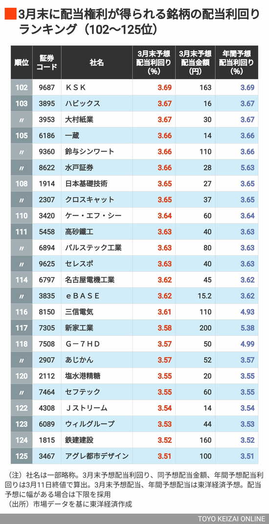 政治・経済・投資 利回り4%以上が61銘柄、首位は6%超! 3月に権利取りできる「配当利回りの高い銘柄」ランキングTOP202 3分で読める 公開日時:2026/03/16 05:45 東洋経済オンライン編集部 フォロー 1/9 PAGES 2/9 PAGES 3/9 PAGES 4/9 PAGES 5/9 PAGES 6/9 PAGES まだある「利回り3%台後半」の銘柄 次ページが続きます:【お次は126~149位】 7/9 PAGES 8/9 PAGES 9/9 PAGES