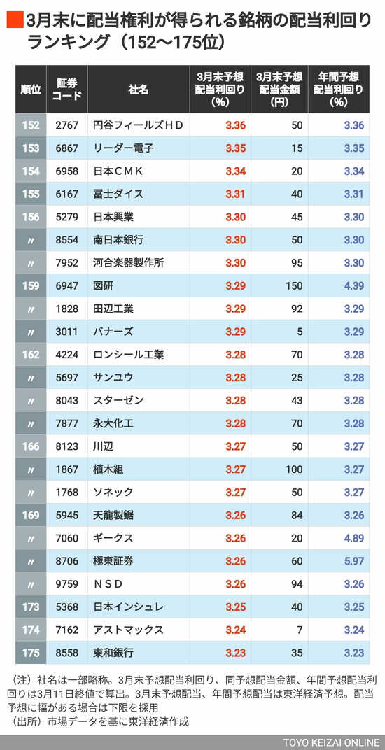 政治・経済・投資 利回り4%以上が61銘柄、首位は6%超! 3月に権利取りできる「配当利回りの高い銘柄」ランキングTOP202 3分で読める 公開日時:2026/03/16 05:45 東洋経済オンライン編集部 フォロー 1/9 PAGES 2/9 PAGES 3/9 PAGES 4/9 PAGES 5/9 PAGES 6/9 PAGES 7/9 PAGES 8/9 PAGES ウルトラマンでおなじみの銘柄もランクイン 次ページが続きます:【最後に176~199位】 9/9 PAGES