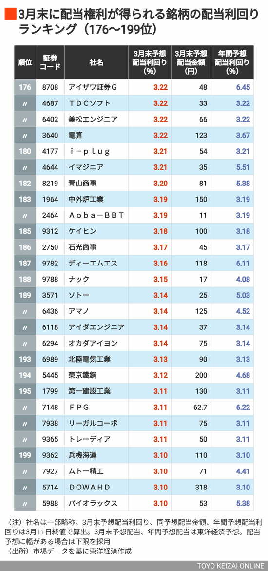 政治・経済・投資 利回り4%以上が61銘柄、首位は6%超! 3月に権利取りできる「配当利回りの高い銘柄」ランキングTOP202 3分で読める 公開日時:2026/03/16 05:45 東洋経済オンライン編集部 フォロー 1/9 PAGES 2/9 PAGES 3/9 PAGES 4/9 PAGES 5/9 PAGES 6/9 PAGES 7/9 PAGES 8/9 PAGES 9/9 PAGES まだまだ続く「利回り3%台」の銘柄 (外部配信先ではランキング表をすべて閲覧できない場合があります。その際は東洋経済オンライン内でご覧ください)