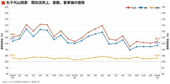 ロードサイド立地にしかないこの店の最近の既存店売上動向は驚異的だ。山岡家の既存店動向は、前々期も前期も大幅な増収が続いている。しかも客単価はほぼ横ばいで、客数の増加が続く一方なのだ。