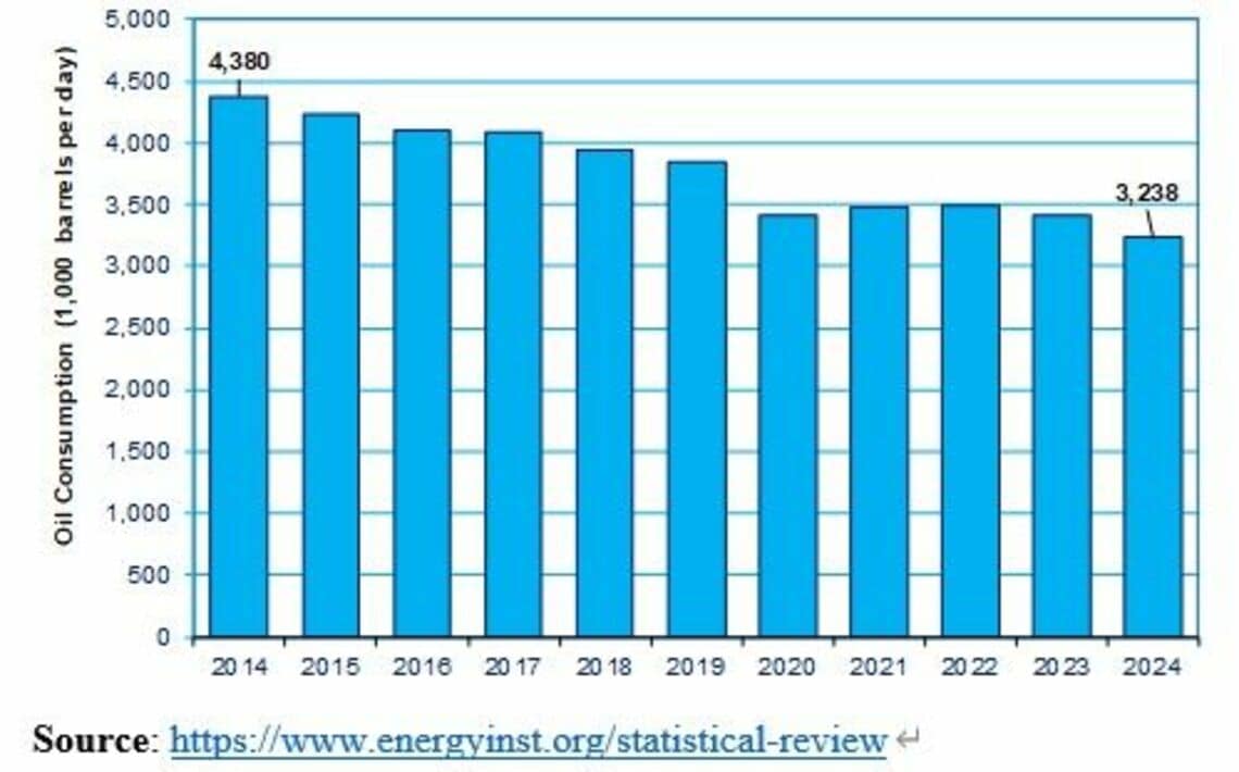 In the name of energy security, Japan has tried to reduce its dependence on oil. Between 2014 and 2024, Japan reduced its daily oil consumption by 26%. For example, it switched from oil to LNG for electricity generation. That was the fourth-largest reduction among 33 mostly rich countries.