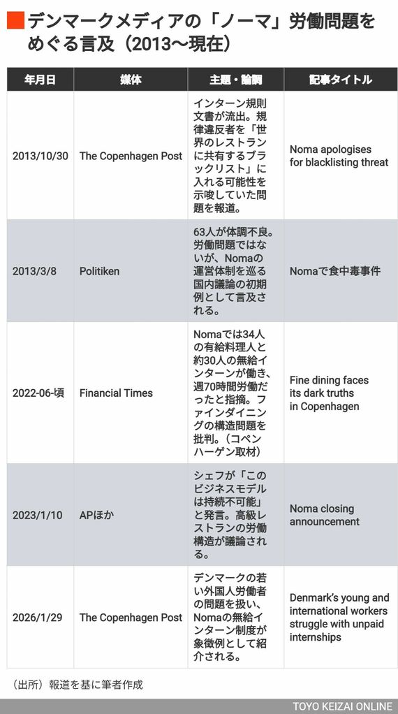 2026年3月7日、ニューヨーク・タイムズ(NYT)は、デンマーク・コペンハーゲンのレストラン「ノーマ」で働いた元スタッフ35人以上への取材をもとに、過去の厨房での虐待を詳しく報じた。