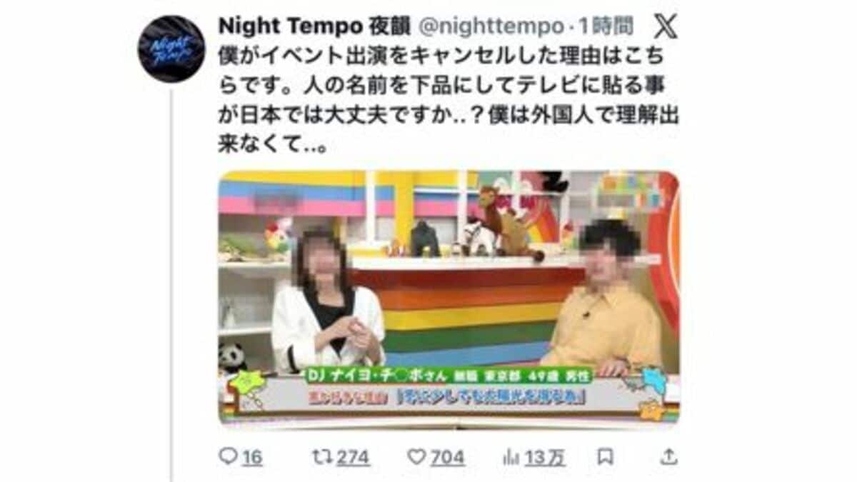問題となったのは、2026年3月11日放送の「5時に夢中!」だ。放送では、視聴者から投稿されたコメントを紹介していたが、とある投稿者のペンネームが問題となった。韓国出身のDJでプロデューサーのNight Tempo(ナイトテンポ)さんの名前を、下ネタにもじったと思われる名称だったのだ。