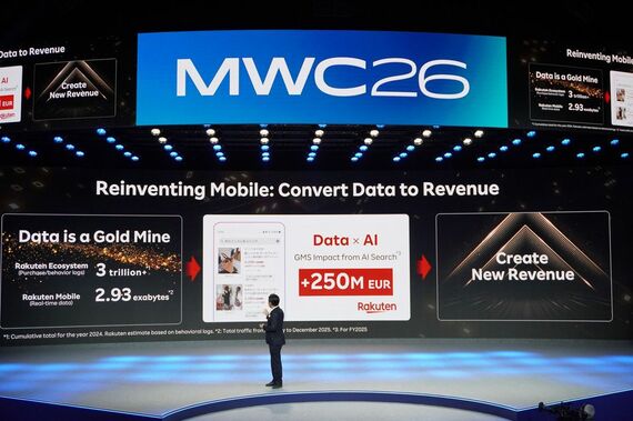 データの活用にも踏み込んだ。楽天グループは年間3兆件以上のデータポイントを蓄積しており、これを広告やサービスの最適化に活用している。データとAIを組み合わせた検索機能の改善だけで、流通総額に約2億5000万ユーロの押し上げ効果があったという。「通信事業者はGoogleやAppleより多くのデータを持っている。データは金脈だ」と、他の通信事業者にもデータ活用を促した。