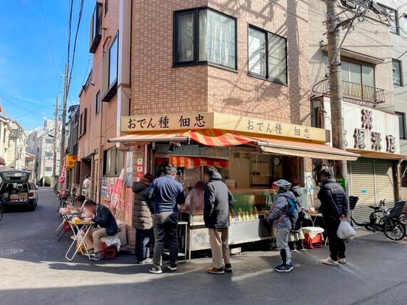 イカ巻、ごぼう巻が70円。シュウマイ、ギョウザ、ウィンナーなどは100円。いちばん高い牛すじが160円。通りに面したレトロなテイストのひさしの上に「おでん種」の看板が見える。一日中行列の絶えない人気のおでん屋「佃忠(北区田端3-8-6)」だ。
