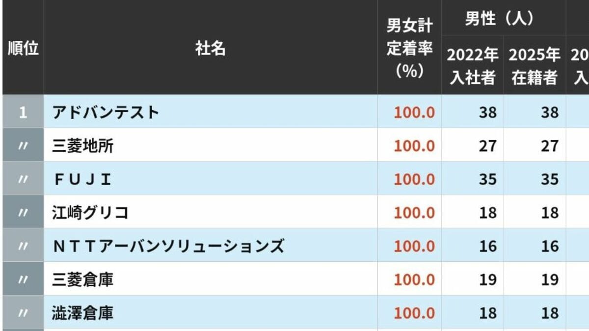 トップ(同率1位)は定着率100%の95社だった。そのなかで、2022年4月の新卒入社者が最多だったのは、半導体検査装置で世界大手のアドバンテストで47人。生成AI関連銘柄として業績も好調だ。同社はグローバルで統一した資格制度、評価制度、賞与制度を導入している。それ以外にも時差出勤、在宅勤務、副業ルールの導入など柔軟な働き方を推進している。