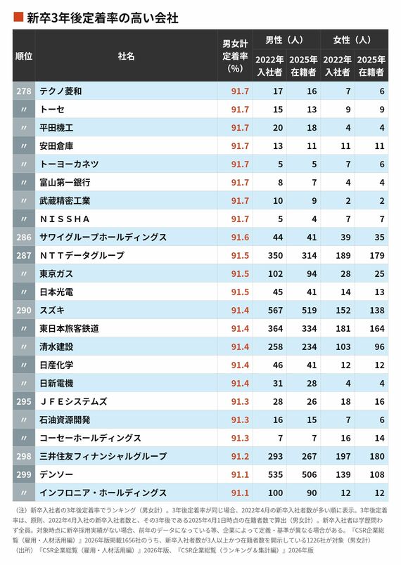 新卒社員が3年後も定着している会社ランキング…定着率100%を実現したのは95社