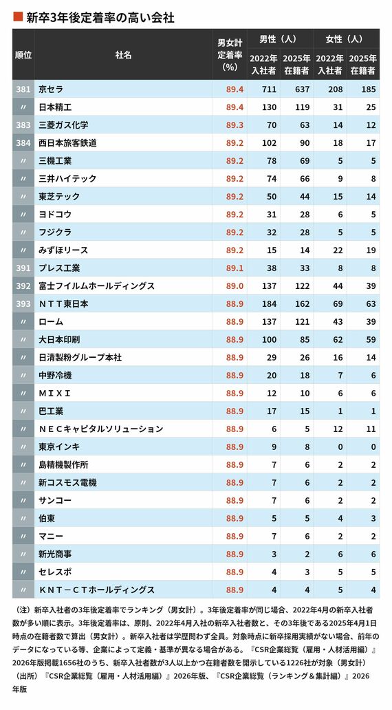 新卒社員が3年後も定着している会社ランキング…定着率100%を実現したのは95社