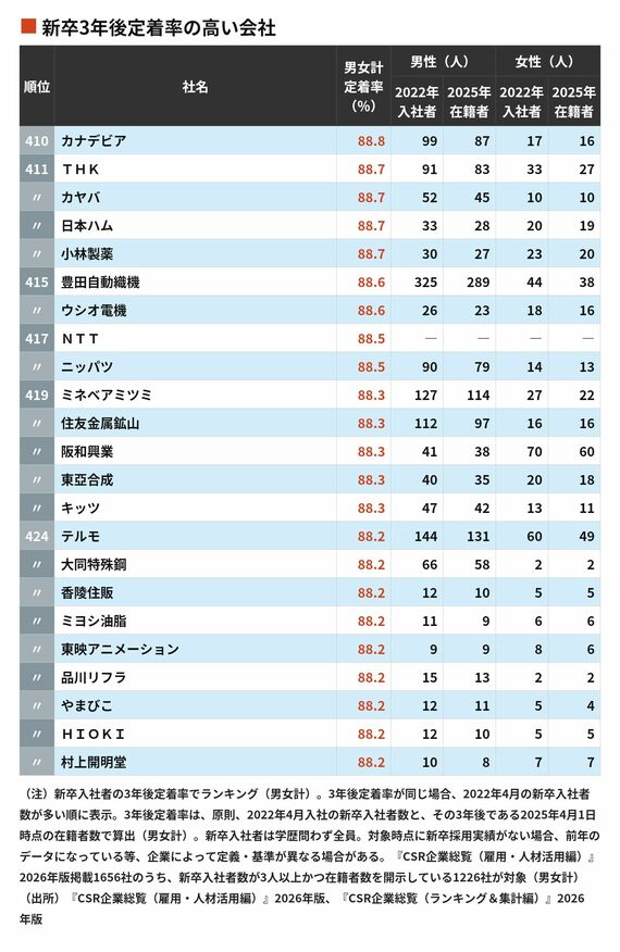 新卒社員が3年後も定着している会社ランキング…定着率100%を実現したのは95社