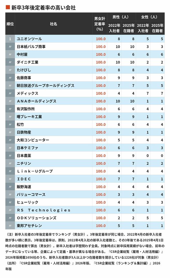 新卒社員が3年後も定着している会社ランキング…定着率100%を実現したのは95社