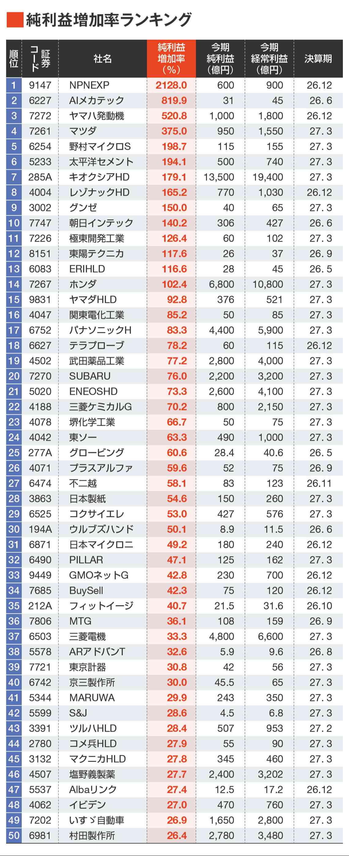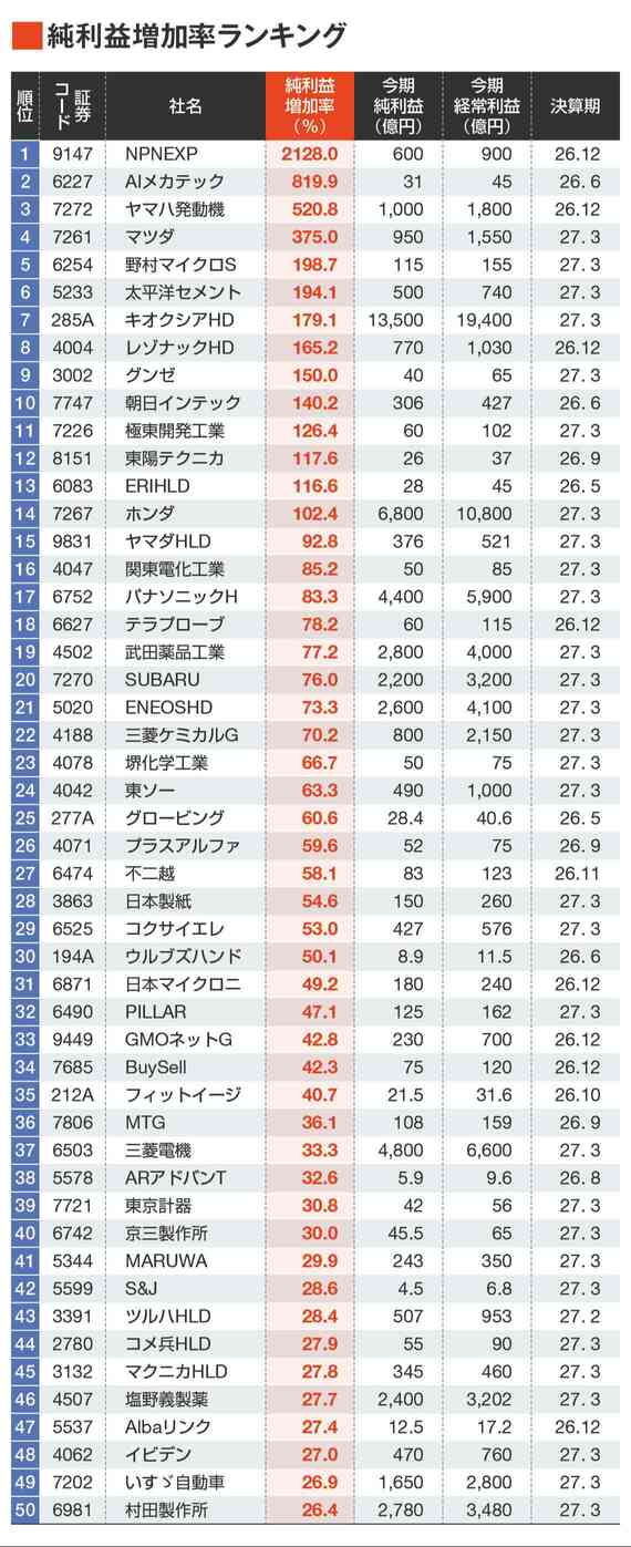 プロ500「春号」連動、純利益増加率トップ50