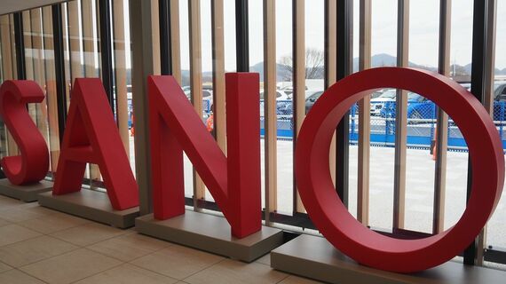 正面から入ると、イチゴの鮮やかな色を想起させる赤い「SANO」の文字モニュメントが迎えてくれた。