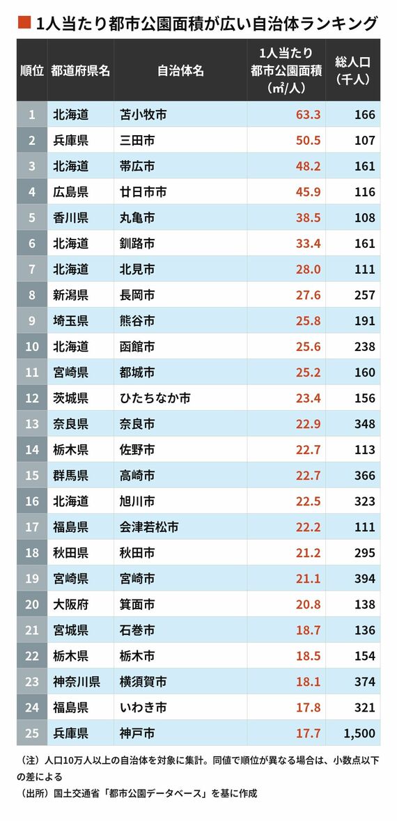 「1人当たり公園面積」が大きい自治体トップ200 10位は北海道函館市、9位は埼玉県熊谷市、ではそれより上位は?