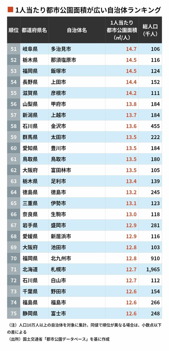 「1人当たり公園面積」が大きい自治体トップ200 10位は北海道函館市、9位は埼玉県熊谷市、ではそれより上位は?