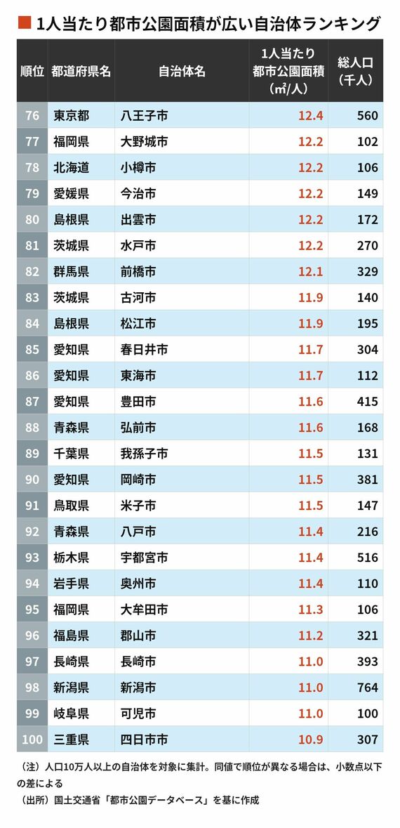 「1人当たり公園面積」が大きい自治体トップ200 10位は北海道函館市、9位は埼玉県熊谷市、ではそれより上位は?