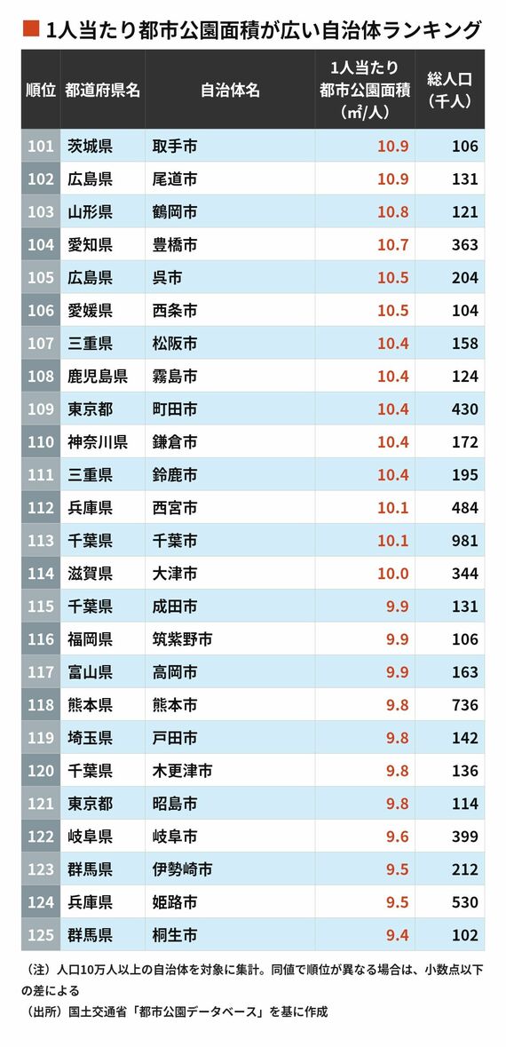 「1人当たり公園面積」が大きい自治体トップ200 10位は北海道函館市、9位は埼玉県熊谷市、ではそれより上位は?