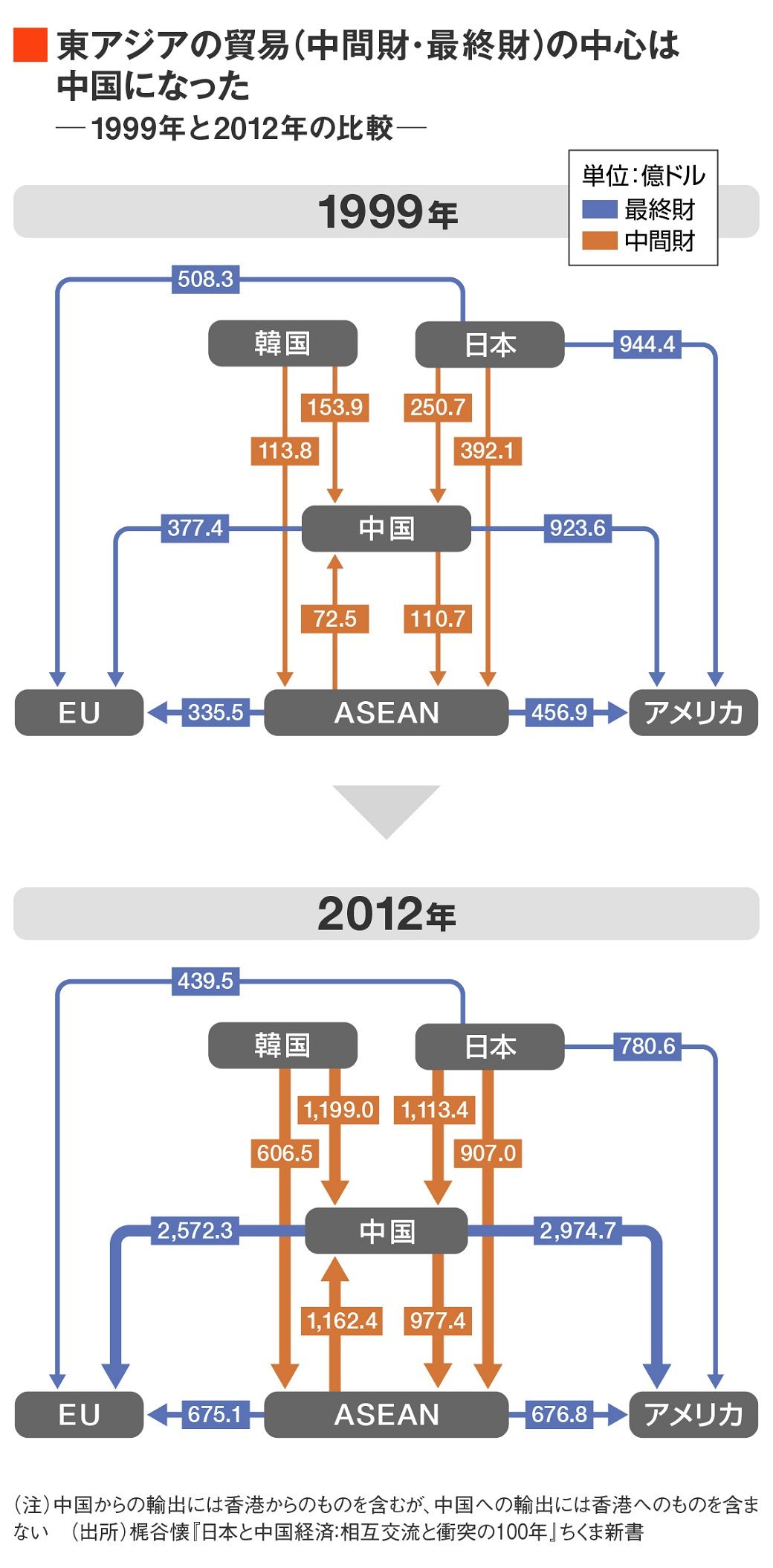 中国が、日本をはじめ韓国、ASEAから中間財を輸入し、最終製品をアメリカやEUに輸出するという貿易・分業パターンが、次第に強固なものになっていったのである。この動きと並行して、拡大する国内市場をターゲットとした日本企業の中国進出も加速していく。