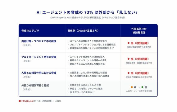 現在提供されているAIセキュリティ診断・監視サービスの多くは、チャット画面やAPIの入出力、つまり外部インターフェースのみを評価・監視の対象としています。OWASP(国際的なセキュリティ標準化団体)が定義するAIエージェントの脅威を当社で分析したところ、実に全体の73%が、外部からの監視では検知困難な問題でした。