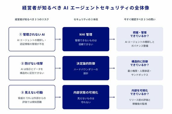 以下の図は、ここまで解説した「3つのリスク」と、それに対応する「セキュリティの3本柱」、そして経営者が確認すべき「3つの問い」の全体像を整理したものです。