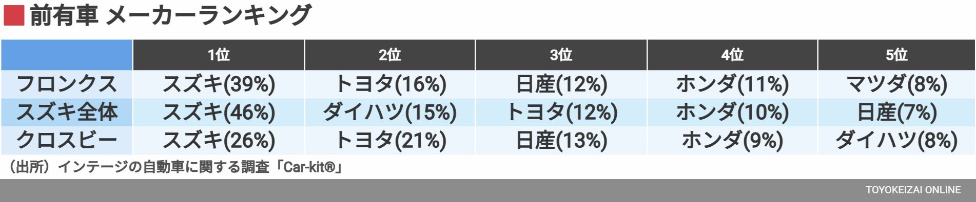 一方、フロンクスでは、「スズキ→スズキ」が39%まで下がる。当然、これは他メーカーからの乗り換えを意味しており、具体的にはトヨタ16%(スズキ全体では12%)、日産12%(同7%)、マツダ8%(同3% ※表の圏外)とトヨタ、日産からの乗り換えが目立った。