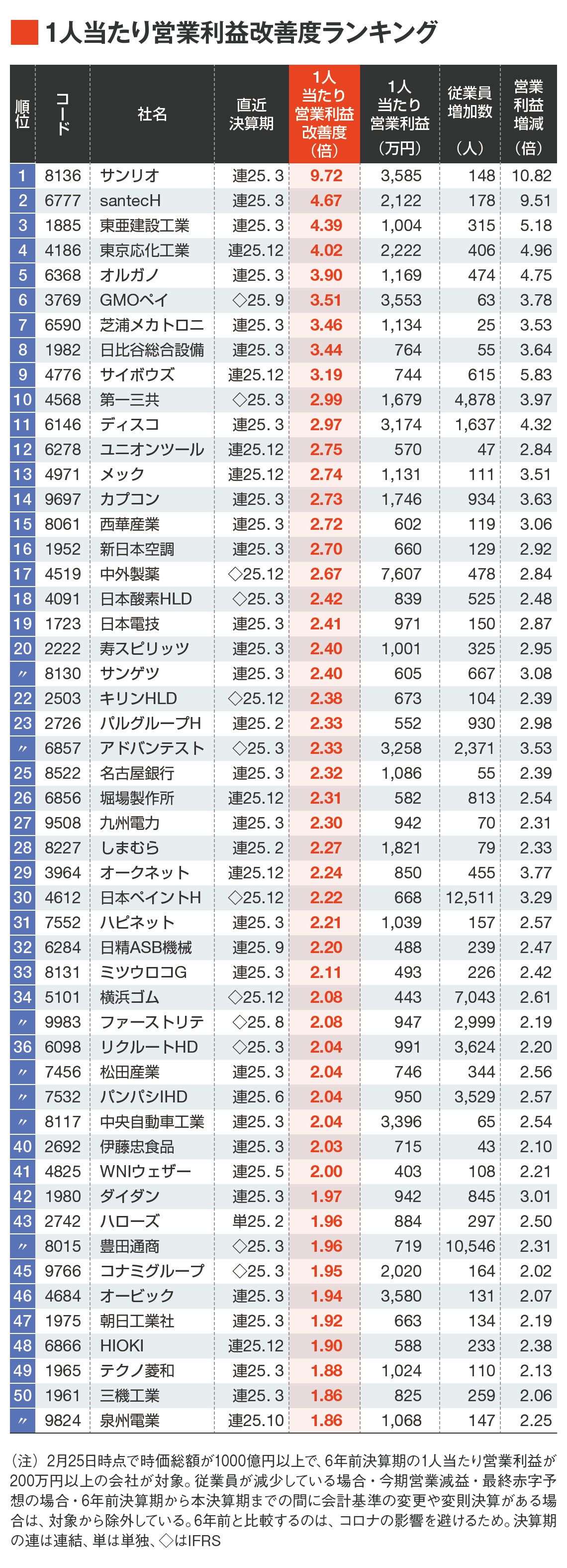 「1人当たり営業利益率改善度」上位50社ランキング