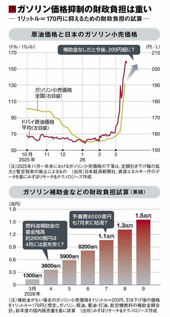 みずほリサーチ&テクノロジーズチーフ日本経済エコノミストの服部直樹氏は、ガソリンなどの前年販売量を基に補助金に要する額を試算。ガソリン価格は原油価格高騰につれ、1リットル=200円まで上がると見込まれる。高市首相は同170円程度に抑えると表明しており、燃料油補助金の基金残高約2800億円は4月中に底を突く。予備費から8000億円を積み増す方針だが、7月末には枯渇する見込みだ。