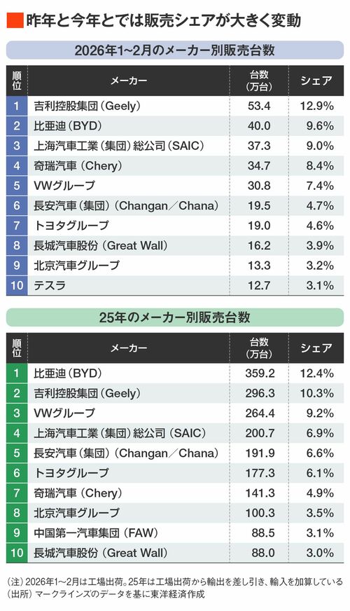 日本車の販売台数は21年に453万台、市場シェアは2割を占めていたが、25年には3010万台のうち292万台と160万台以上減らし、市場シェアも9.7%と1割を切った。