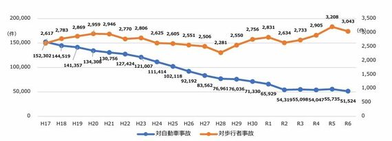 それによれば、自転車関連事故件数は過去20年間で半数以下に減り、24年度では6万7531件となったという。これは対自動車事故が減少したためで、自動車の予防安全技術の発達の効果も大きいと考えられるが、その一方で対歩行者事故は増加傾向にある。