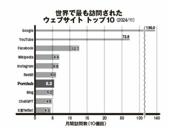そしてなんと、7位に約53億回で、インターネットポルノサイト「Pornhub(ポルノハブ)」がランクインしているのです。ちなみに15位にもインターネットポルノサイトが入っています。