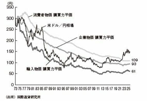 もう少し詳細に見ると、1980年代後半からアベノミクスが始まる2013年頃までの相場は、企業物価と輸入物価の間で推移していました。そして2022年以降は、消費者物価で計算した購買力平価を大きく上に抜けて上昇してしまっています。