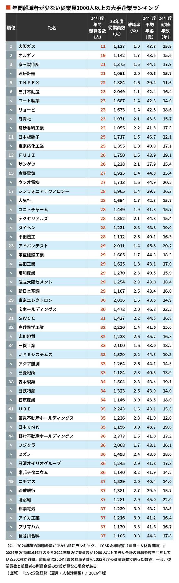 離職する人が少ない大企業ランキングTOP100 1位は従業員1000人以上で離職率1.0%