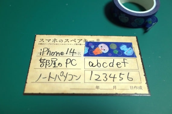 コロナ禍の少し前、2019年の夏にこの方法を思いつき、このカードを「スマホのスペアキー」と名付けた。各テープの本来の使い方ではないが、特別な道具を使わずにパスワードが守れるならそれに越したことはないだろう。
