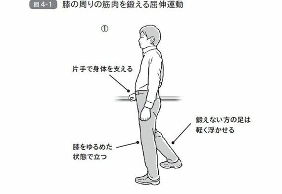 私はその先輩先生に勧められた通り、片手で身体を軽く支えながら、毎日片足立ちで膝を前に屈伸する運動(図4‐1)を始めた。
