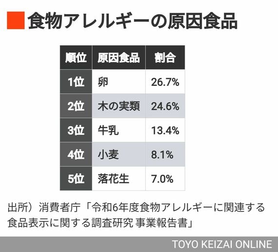 食物アレルギーと聞くと、卵や小麦、そばなどを思い浮かべる人が多いかもしれない。しかし近年、原因となる食品の傾向にも変化がみられている。消費者庁の調査によると、即時型食物アレルギーの原因となる食品の上位は次の通りだ。