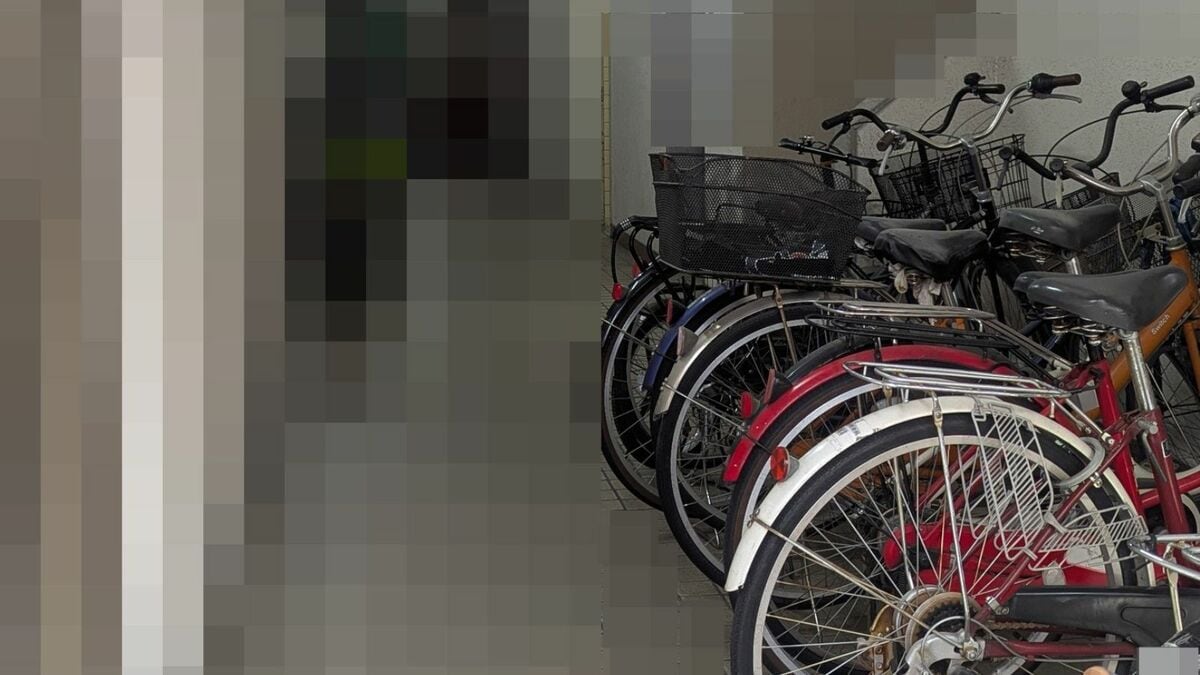 自転車が1台、壁に立てかけられている。その隣には衣類がずらりと並んだハンガーラック。反対の壁際にはスチールラックに布が垂れ下がり、天板の上にはホコリと枯れ葉が積もっている。