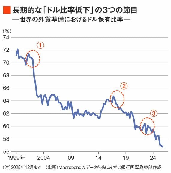 しかし、図に示すように、世界の外貨準備におけるドル比率低下は四半世紀以上続いている長期的な潮流でもある。最近に始まった議論ではない。