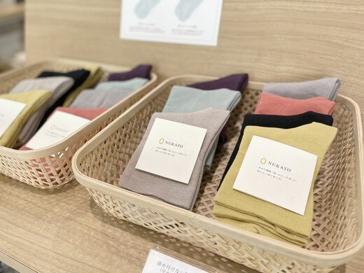 「締め付けない靴下」と命名されたその靴下は、足先からギューっと撫で上げると形状記憶されてずり落ちない。米ぬか繊維の生地は、やわらかくなめらかだ。