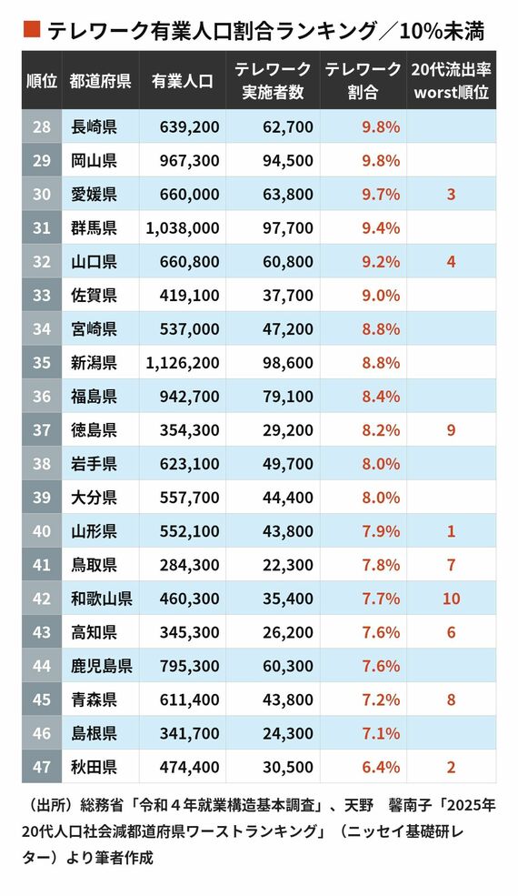 筆者は研究所から20代人口の社会減(転出超過)ランキングを毎年発表しているが、20代男女の対前年20代人口比流出率でワースト10位に入る県のうち、実に9エリアが、リモート有業人口割合10%未満に入っている状況となっている。
