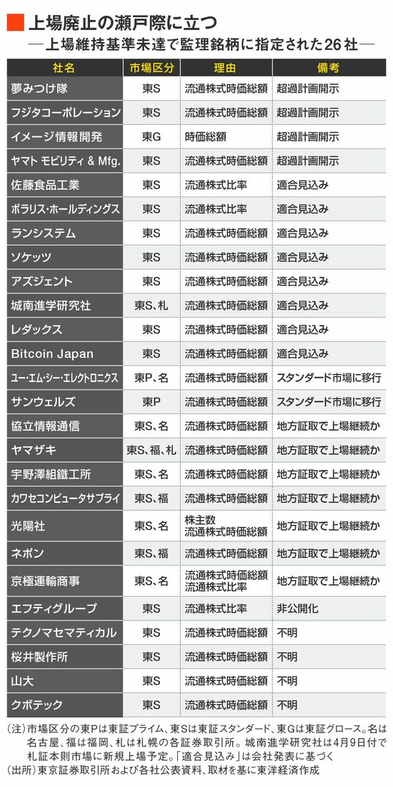 さしずめ「最後通牒」といったところか。東京証券取引所は4月1日、上場廃止予備軍である「監理銘柄」に多数の上場企業を指定した。このうち26社は流動性や時価総額といった上場維持基準に適合できなかったことが原因だ。