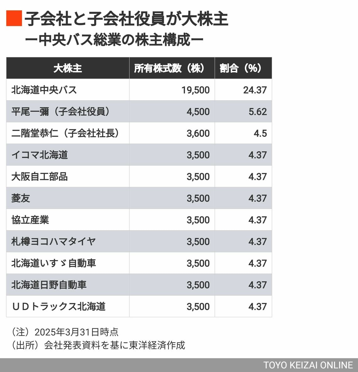 25年5月に適時開示された「支配株主等に関する事項について」によれば、中央バス総業が北海道中央バスの議決権40%超(間接保有含む)を所有する親会社となっている。このことに問題はない。