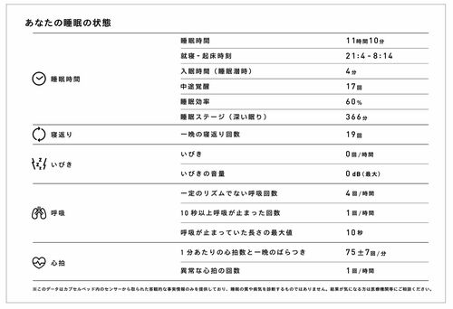 悪くない結果もあった。いびきの回数と音量は、ともにゼロ。そして横になってから眠りに落ちるまで、わずか4分。睡眠時無呼吸症候群や不整脈・心房細動などの、疾病の兆候もなさそうだ。