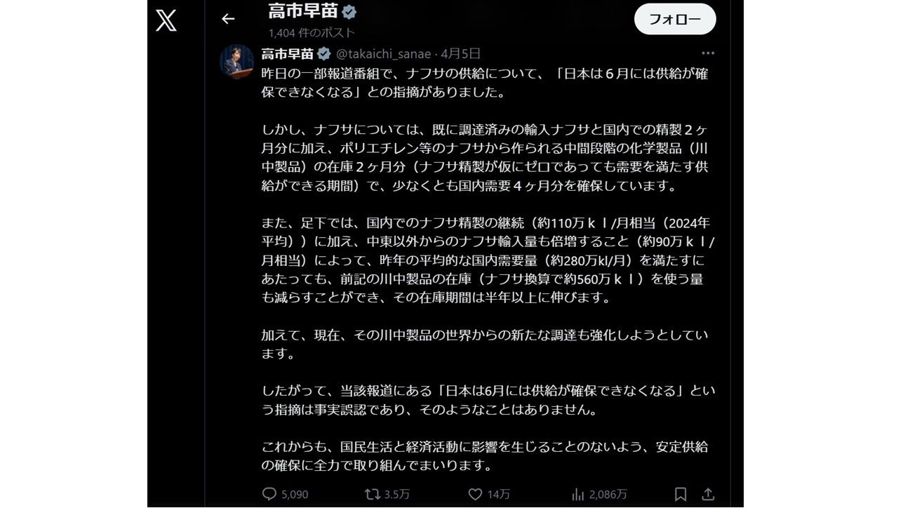 『昨日の一部報道番組で、ナフサの供給について、「日本は6月には供給が確保できなくなる」との指摘がありました。ナフサについては、既に調達済みの輸入ナフサと国内での精製2ヶ月分に加え、ポリエチレン等のナフサから作られる中間段階の化学製品(川中製品)の在庫2ヶ月分(ナフサ精製が仮にゼロであっても需要を満たす供給ができる期間)で、少なくとも国内需要4ヶ月分を確保しています。