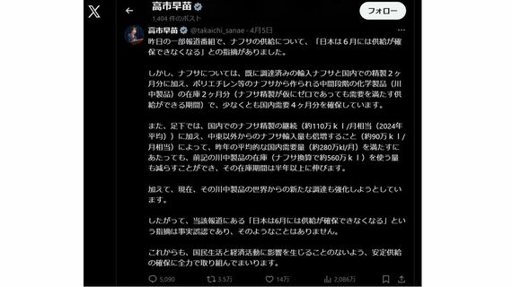 『昨日の一部報道番組で、ナフサの供給について、「日本は6月には供給が確保できなくなる」との指摘がありました。ナフサについては、既に調達済みの輸入ナフサと国内での精製2ヶ月分に加え、ポリエチレン等のナフサから作られる中間段階の化学製品(川中製品)の在庫2ヶ月分(ナフサ精製が仮にゼロであっても需要を満たす供給ができる期間)で、少なくとも国内需要4ヶ月分を確保しています。